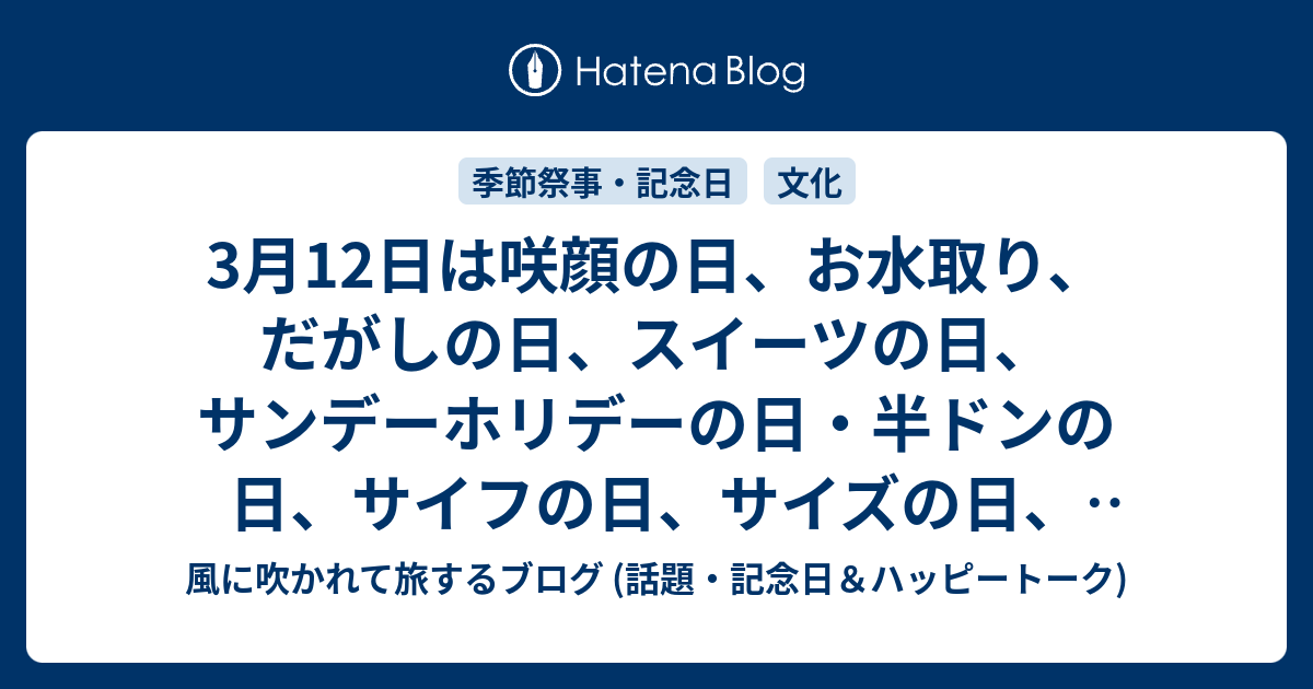 3月12日は咲顔の日 お水取り だがしの日 スイーツの日 サンデーホリデーの日 半ドンの日 サイフの日 サイズの日 モスの日 等の日です 風に吹かれて旅するブログ 話題 記念日 ハッピートーク